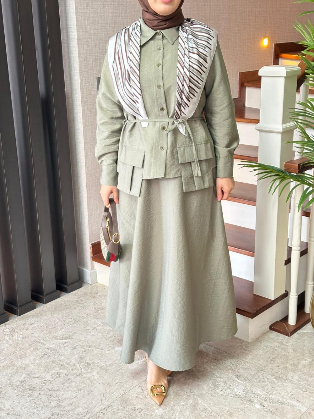 Etek boy 100 cm’dir, yadan fermuarlı ve beli lastiklidir.