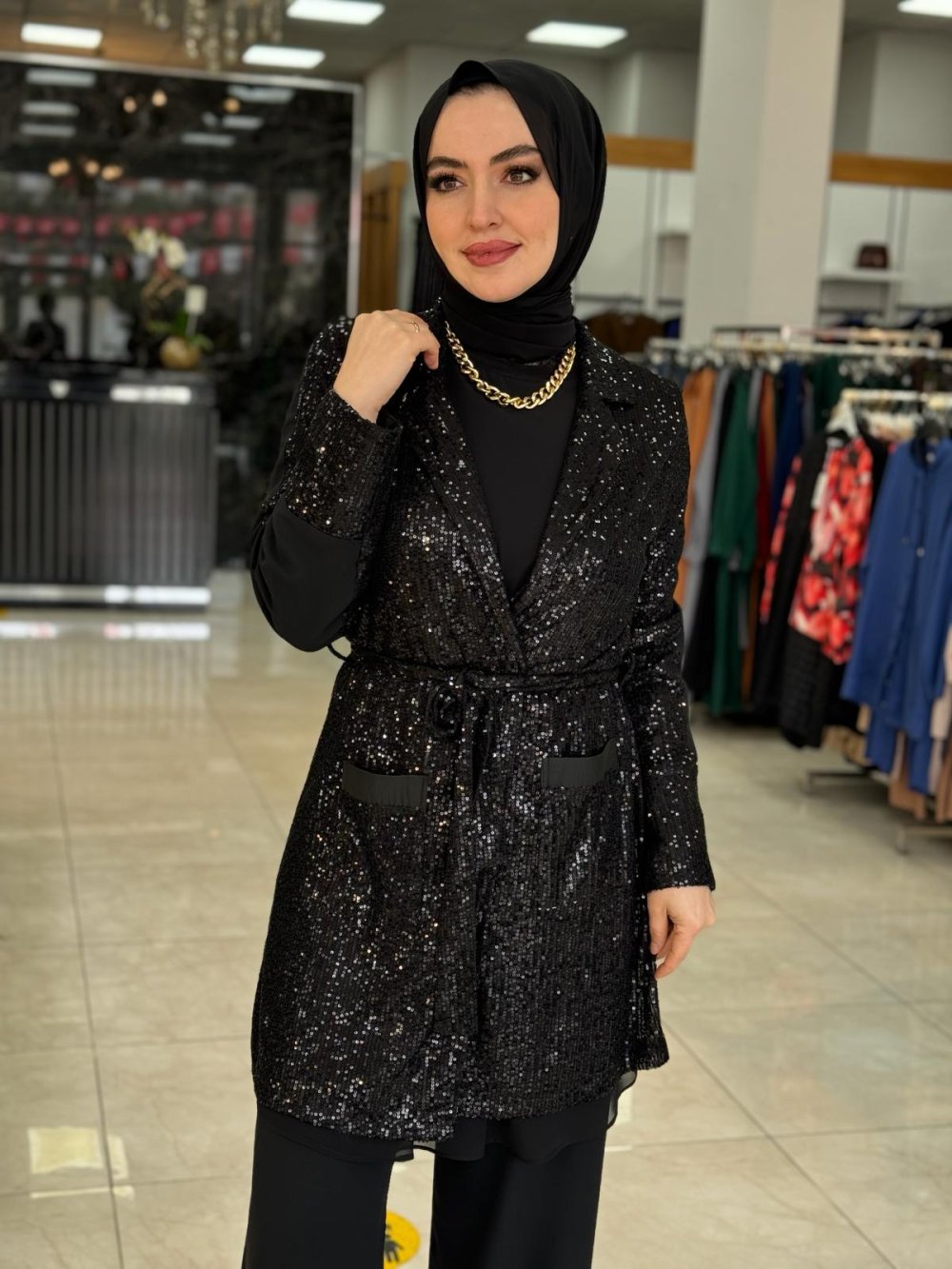 Ceket kumaşı pul payettir. Pantolon kumaşı içi denyeli şifondur.