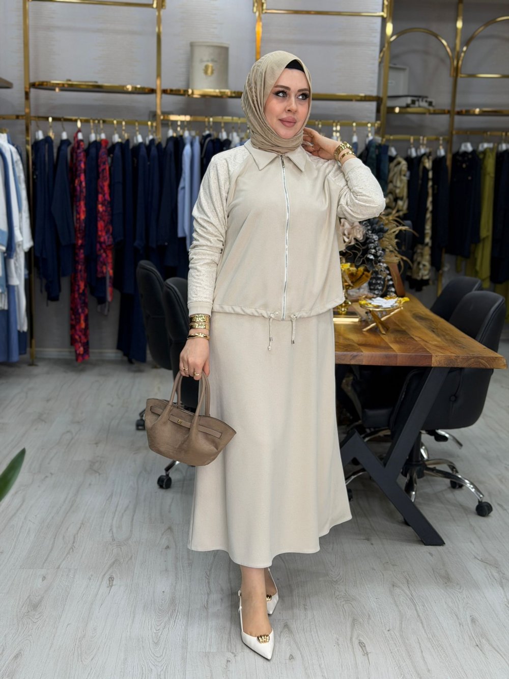 Kumaşı örmedir. Etek beli lastiklidir. Tunik fermuarlıdır. Cep yoktur.