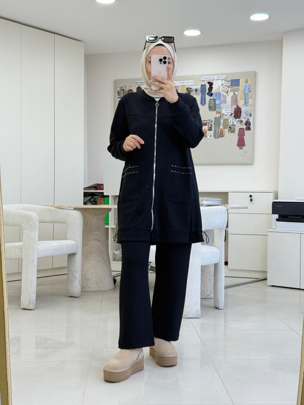 Tunik boy 85 cm’dir. Önünde metal dişli fermuarı ve yanlarda taşlı cepleri mevcuttur.