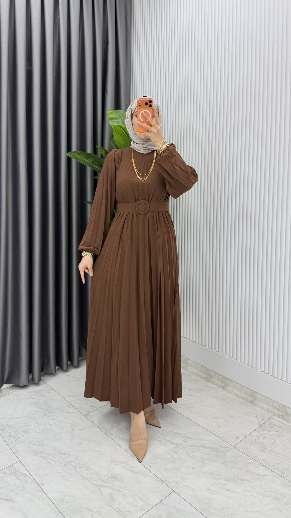 Kahve Hifa Piliseli Elbise Tesettür Giyim