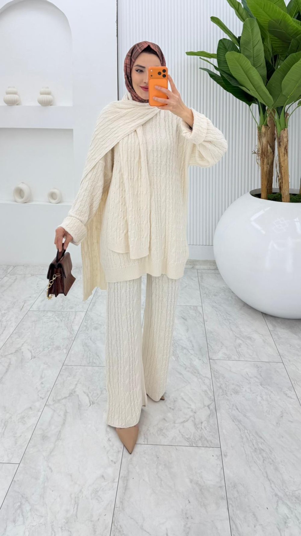 Krem Premıum Atkılı Triko Takım Tesettür Giyim