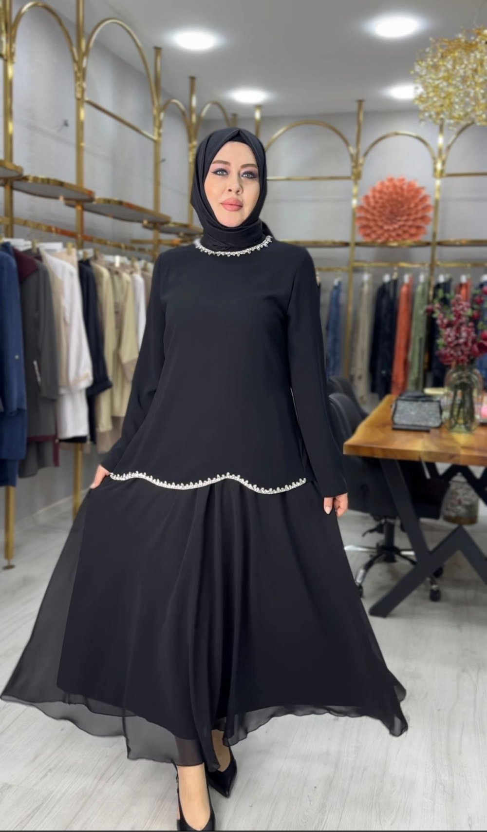 Kumaşı suzanna kumaştır. Bluz yaka ve Eteği taşlı yapıştırmadır.