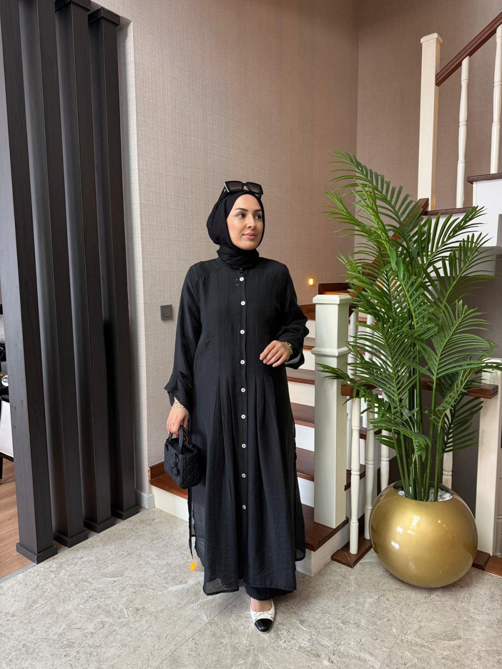 Tunik boy 125 cm’dir. Önü nervürlüdür, sedef düğme detaylıdır.