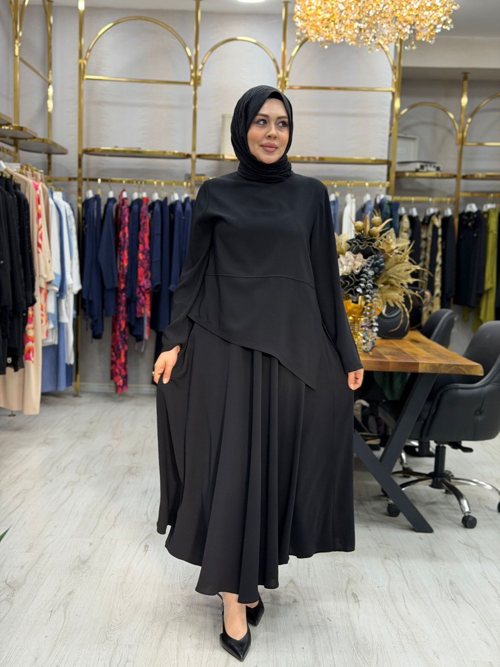 Kumaşı kreptir. Etek beli lastiklidir. Tunik arkası düğmelidir.