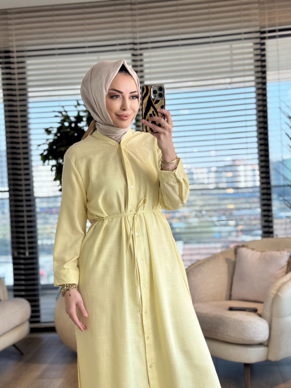MRW1794 V Yaka Düğmeli Uzun Keten Gömlek Sarı