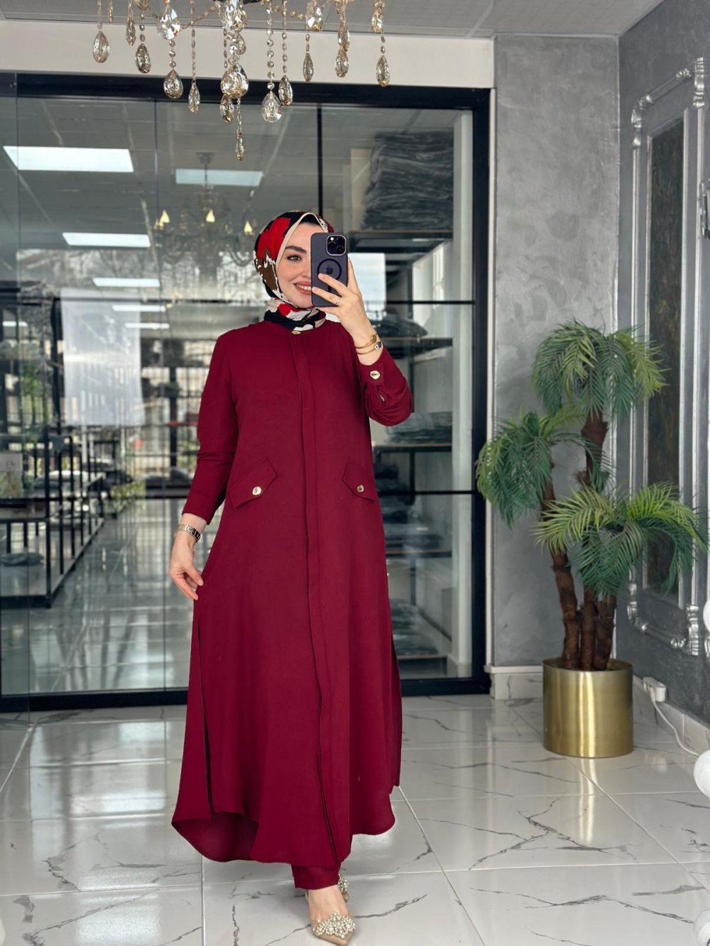 Kumaşı krep kumaştır. Kap Sahte Cep Kapaklı,Kol Ağızı Manşet Düğme,Kap Yan Yırtmaçlı,Pantolon Bel Lastiklidir.