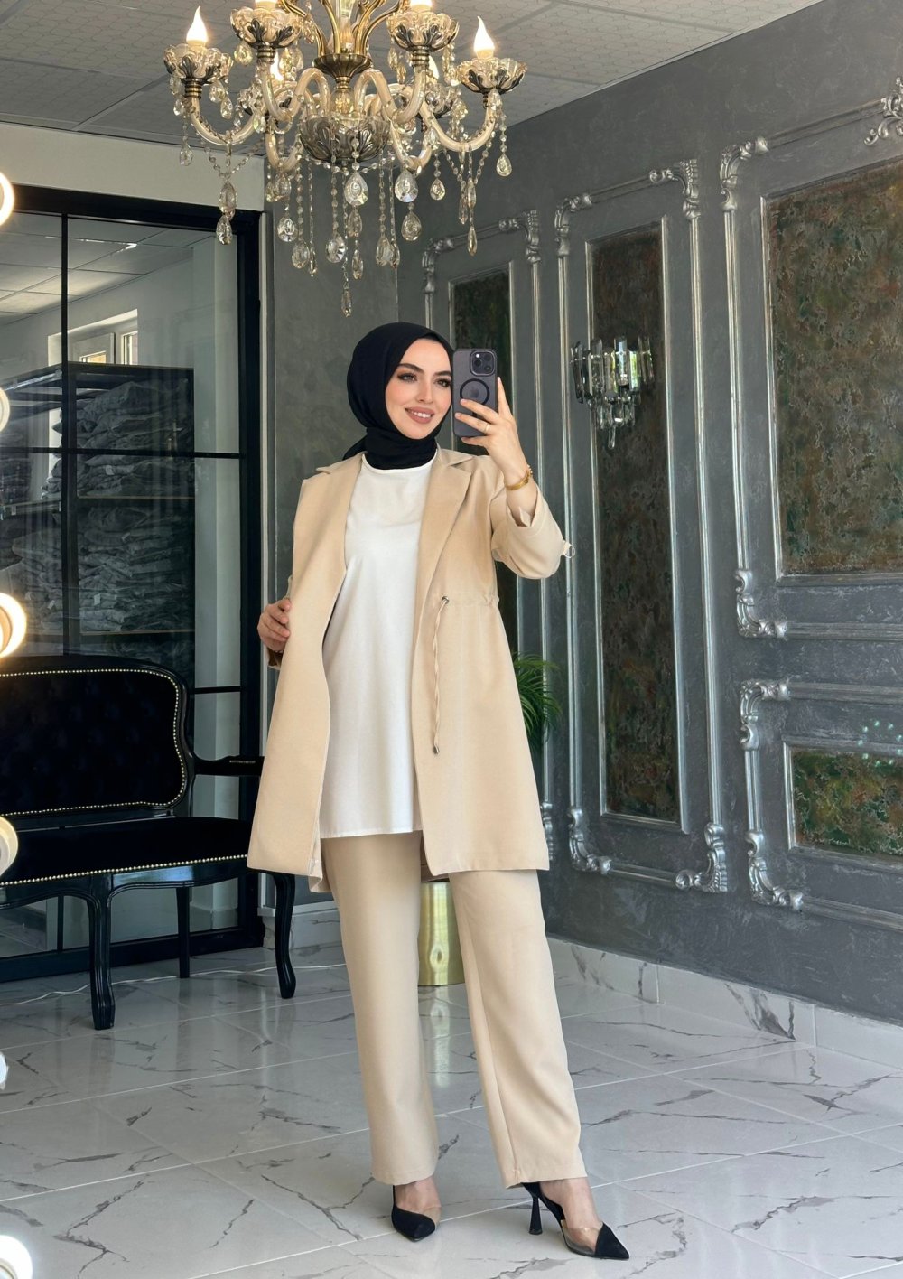 Kumaşı kreptir. Pantolon beli lastiklidir. İçlik sıfır kolludur.