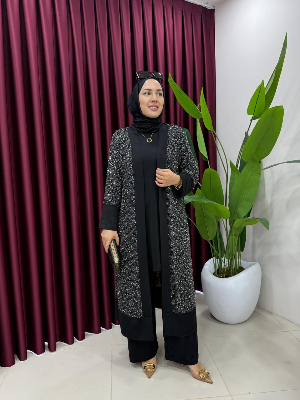 Dış kap payetlidir, boy uzunluğu 120 cm’dir.