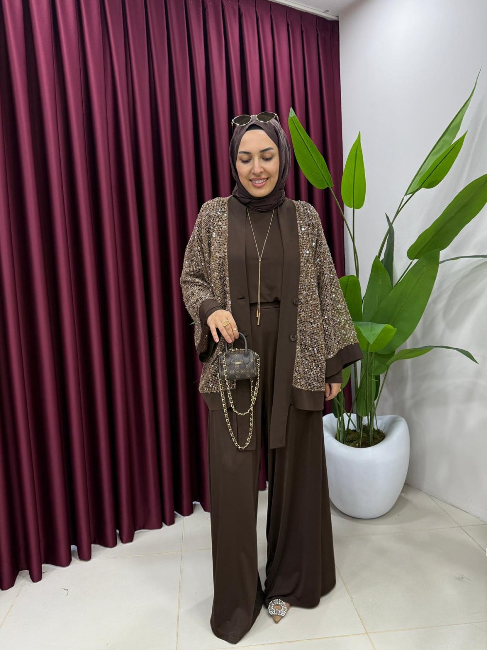 Payetli Üçlü Takım Kahverengi