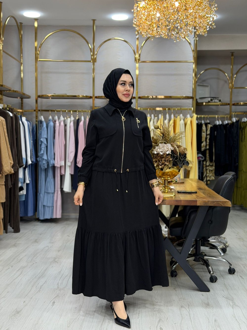 Elbisenin arkası yarım fermuarlıdır. Ceket önü fermuarlıdır.