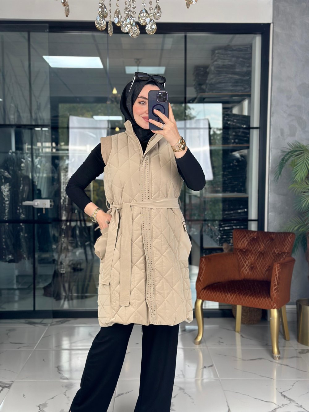 Kumaşı desenli kapitone kumaştır. Önü gizli fermuarlıdır. Seyyar kemeri