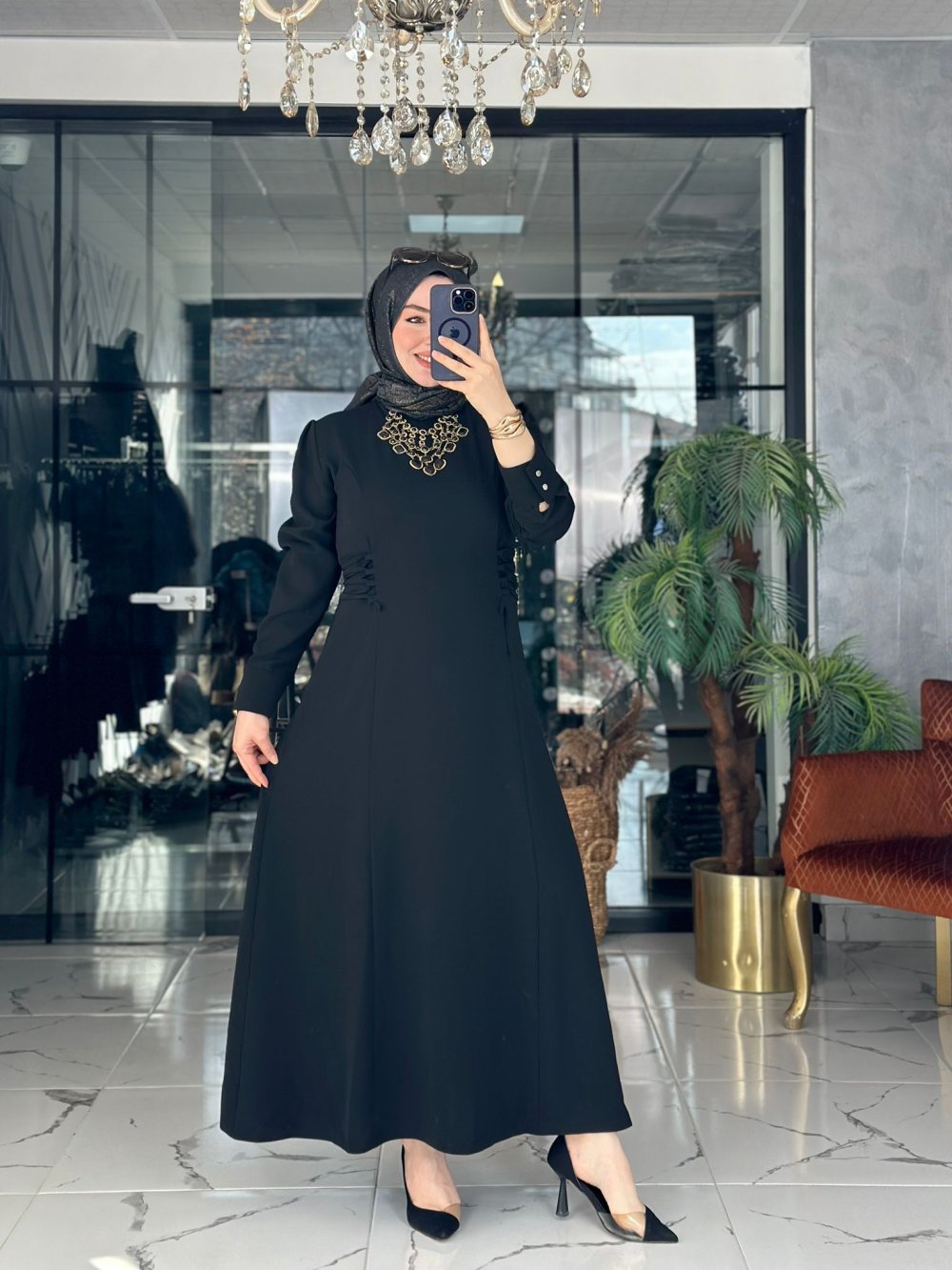 Kumaşı krep kumaştır. Arkası yarım fermuarlıdır.